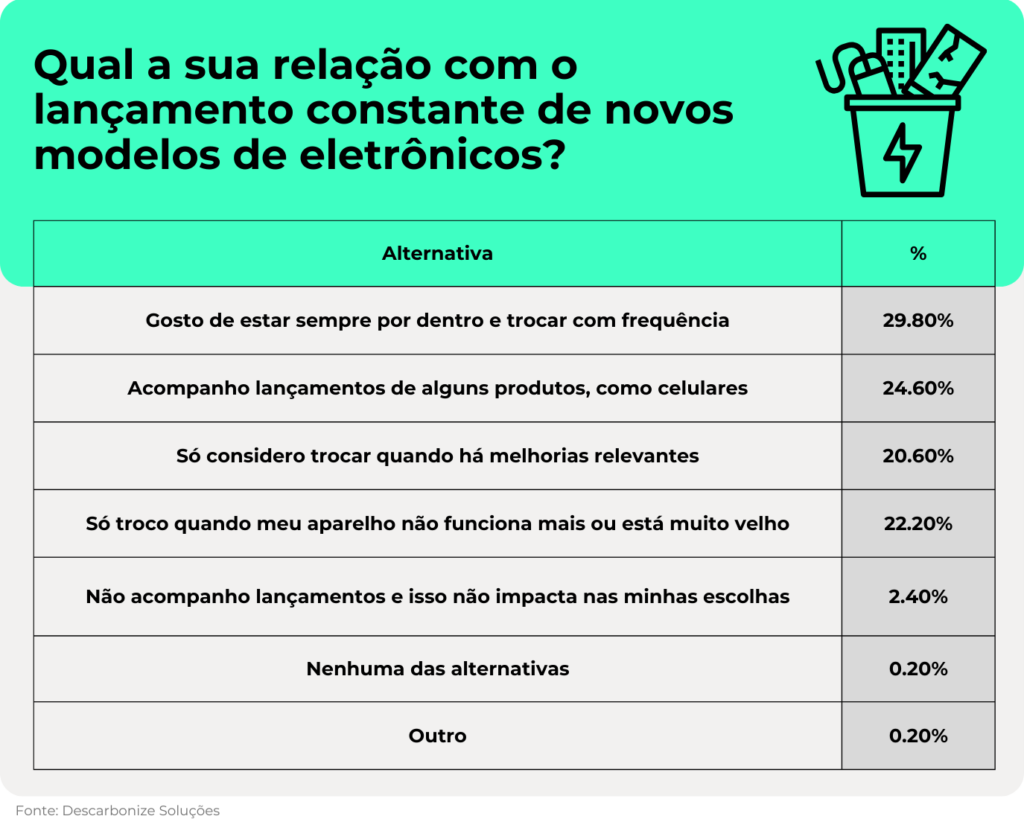 O dado ganha ainda mais relevância diante do fato de que 89% dos consumidores não consideram a geração de lixo eletrônico no momento da troca do aparelho, sendo o fator menos relevante na decisão. Durabilidade e qualidade (75%), os preços e promoções (55%) e a marca (53%) foram indicados como as condições mais importantes.