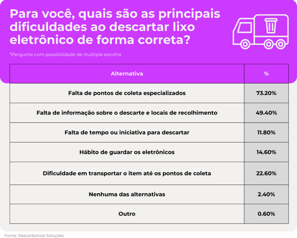Quando perguntados sobre as principais dificuldades ao descartar lixo eletrônico, 73% dos participantes da pesquisa indicaram a falta de pontos de coleta especializados como o maior obstáculo. Na sequência, aparecem a falta de informações sobre o descarte e recolhimento (49%) e a dificuldade de transportar o item até os pontos de coleta (23%).