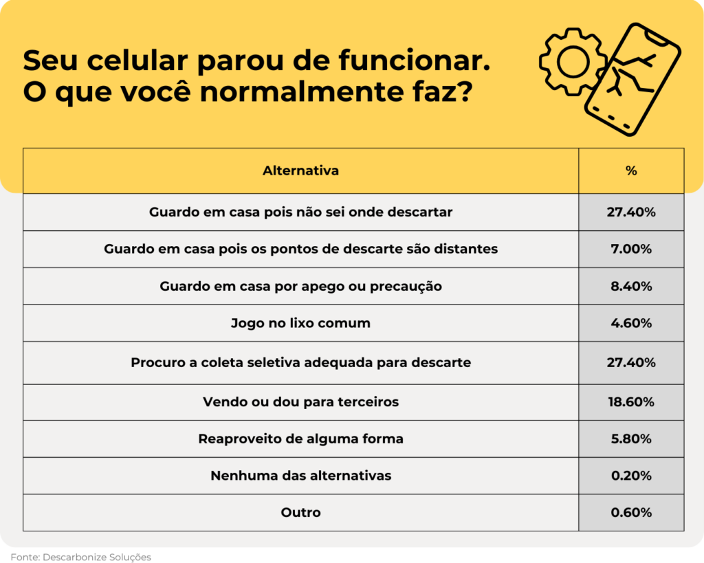 O cenário passa a fazer ainda mais sentido quando 43% dos entrevistados do estudo afirmaram que mantêm os celulares antigos em casa, principalmente por não saberem onde descartar os equipamentos ou porque os pontos de coleta são muito distantes.