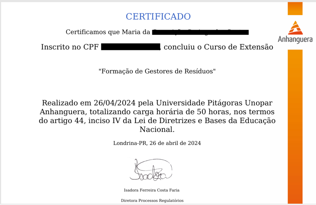 Certificado emitido pelo Portal Sustentabilidade e Universidade Pitágoras Unopar Anhanguera